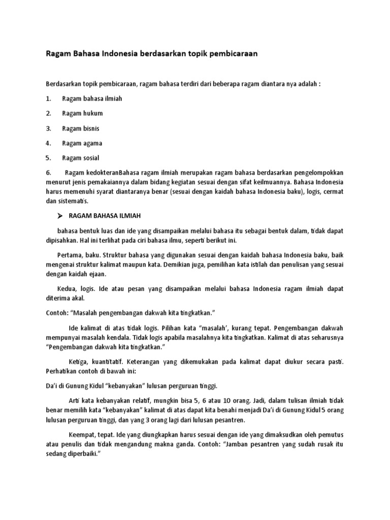 Ragam bahasa menurut fishmaned (1968) suatu ragam bahasa, terutama ragam bahasa jurnalistik dan hukum, tidak tertutup kemungkinan untuk menggunakan bentuk kosakata ragam bahasa baku agar dapat menjadi anutan bagi masyarakat pengguna bahasa indonesia. Penutur sering mengulangi beberapa kalimat. Kalimat dalam ragam bahasa tulis lengkap secara gramatikal. Dia dihukum karena melakukan tindak. Ragam bahasa hukum adalah bahasa indonesia yang corak penggunaan bahasanya khas b.